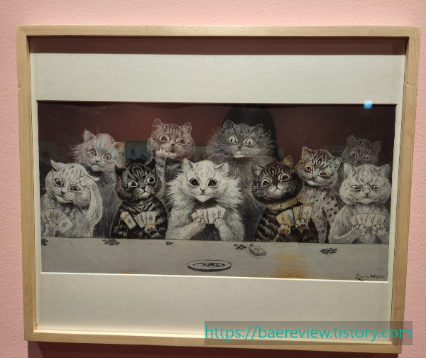 전시회 구성 도 너무 좋았고, 벽지 하나하나에서도 고양이들을 구경하는 재미가 있었습니다. 얼마나 정성드레 구성한 전시회인지 알 수 있었습니다. 그리고 섹션별로 주제에 맞는 벽지 색깔까지, 루이스 웨인 작품들을 더욱 돋보이게 한 듯합니다.