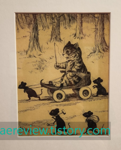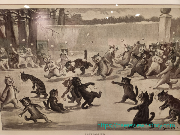 루이스 웨인 가라사대, 고양이를 사랑하는 모든 사람은 정말로 상냥한 심성을 가지고 있다고 합니다. 그만큼 고양이를 좋아했고, 자신의 성격을 묘사한게 아닌가 하는 것 같은데.. 아무튼 루이스 웨인의 고양이들은 단순히 사람을 흉내내는 것에 멈추지 않았습니다. 새끼 고양이들은이 동급생 친구들과 학교 가는 모습, 장난치다 혼나는 모습, 날이 좋은 날에 크랏켓이나 골프 즐기는 모습들을 그린 작품을 감상할 수 있었습니다.