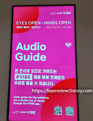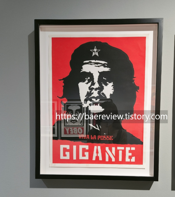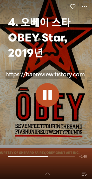 바이브 앱에서 무료로 들을 수 있습니다. 총 25개 정도의 가이드 설명이 있었고, 전시 내부엔 한 작품마다 구체적인 설명을 해놓고 있진 않아서, 오디오 가이드 들으시는 거 추천 드립니다. 특히, 셰퍼드 페어리의 전시작품엔 숨겨진 상징적 의미들이 많아서, 상징적 의미와 왜 이 작품을 만들었는지, 어디에서 착안했는지, 그리고 어떤 의도로 만들었는지 상세한 설명을 들을 수 있었습니다.