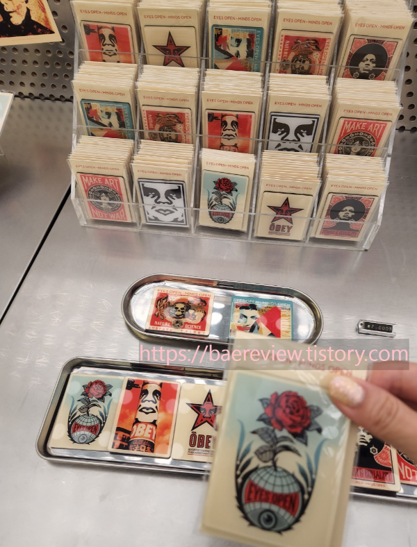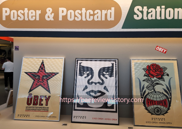 셰퍼드 페어리 행동하라 전시회 입구에서부터 굿즈 매장을 구경하실 수 있습니다. 타 전시회에 비해서 굿즈가 다양한 편은 아니었습니다.