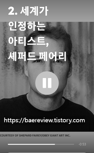 셰퍼드 페어리가 거리 예술로부터 정치/사회/ 대중문화를 아우르며 자리잡은 그의 인생과, 작품 세계에 대해 다큐멘터리 형식의 영상을 감상하실 수 있습니다. 셰퍼드 페어리의 지인들의 인터뷰도 나옵니다. 로비커널을 통해 삶의 전환점을 찾았고, 예술의 민주화를 추구했다는 점, 그리고 정치적 이미지를 잘 활용하고 있다는 점을 알수 있었습니다.