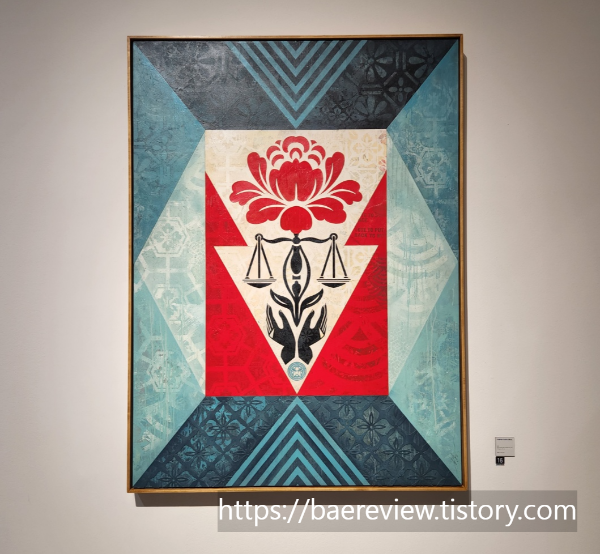 위 작품의 제목은 '정의' 입니다. 셰퍼드 페어리는 환경, 인종, 경제적, 성평등 주제 등을 전달할 때 정의란 주관적일 수도 있고 추상적이긴 하나, 부도덕한 일이나 양심의 가책으로부터 스스로 정의를 지키고, 그릇된일을 멀리하라는 메세지를 전달하고 있습니다.
