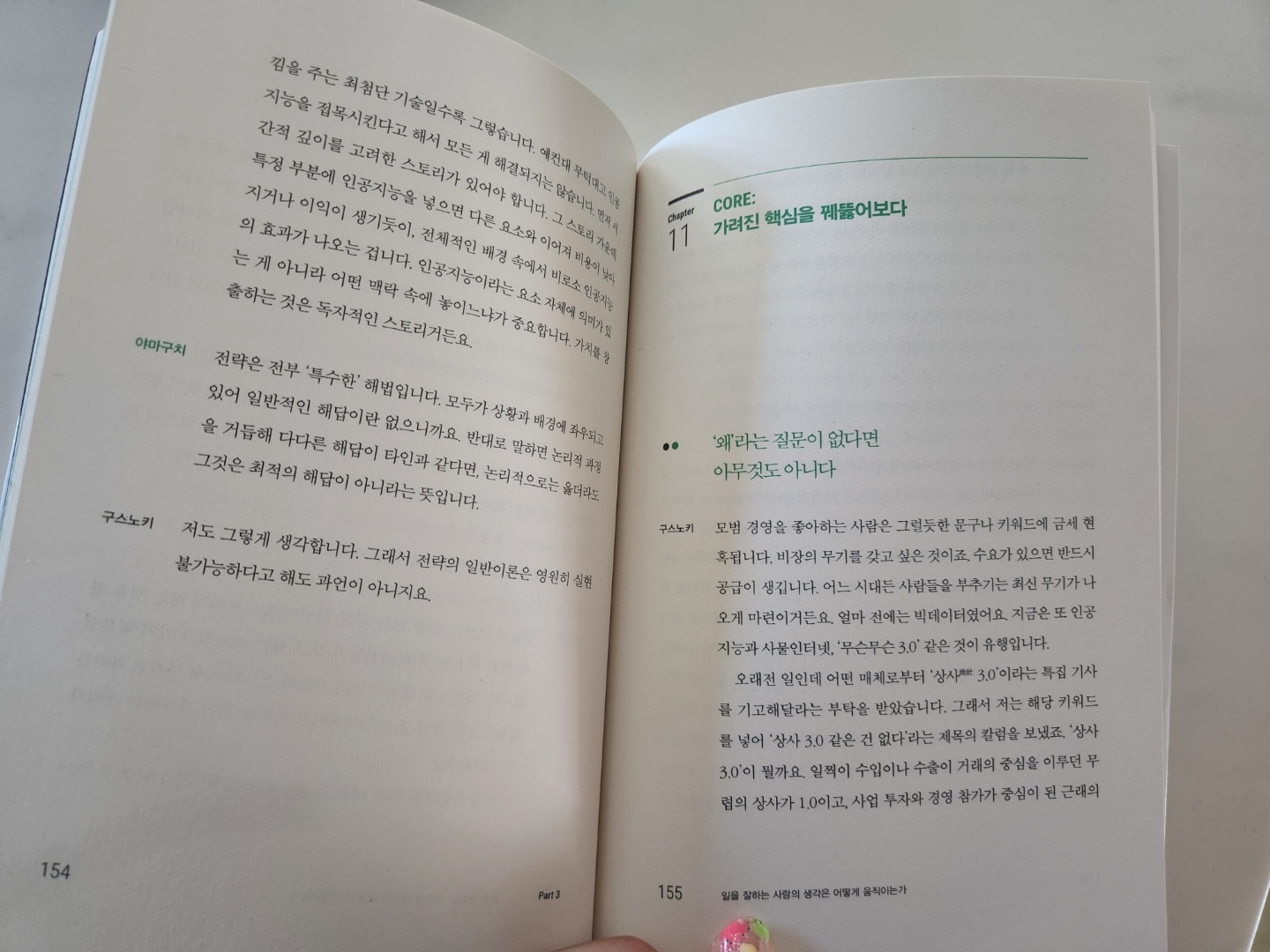 그리고 이 책은 처음부터 끝까지, 일잘하는 사람들이 공통적으로 가지고 있는 것은 감각 SENSE로 설명하고 있습니다. 감각은 키울 수 없지만, 자라나며, 감각이야말로 사후성이 높은 영역으로 두고 있습니다. 그러한 이유로 맨 마지막 장에선, 센스를 기르는 방법을 제시하고 있습니다.
