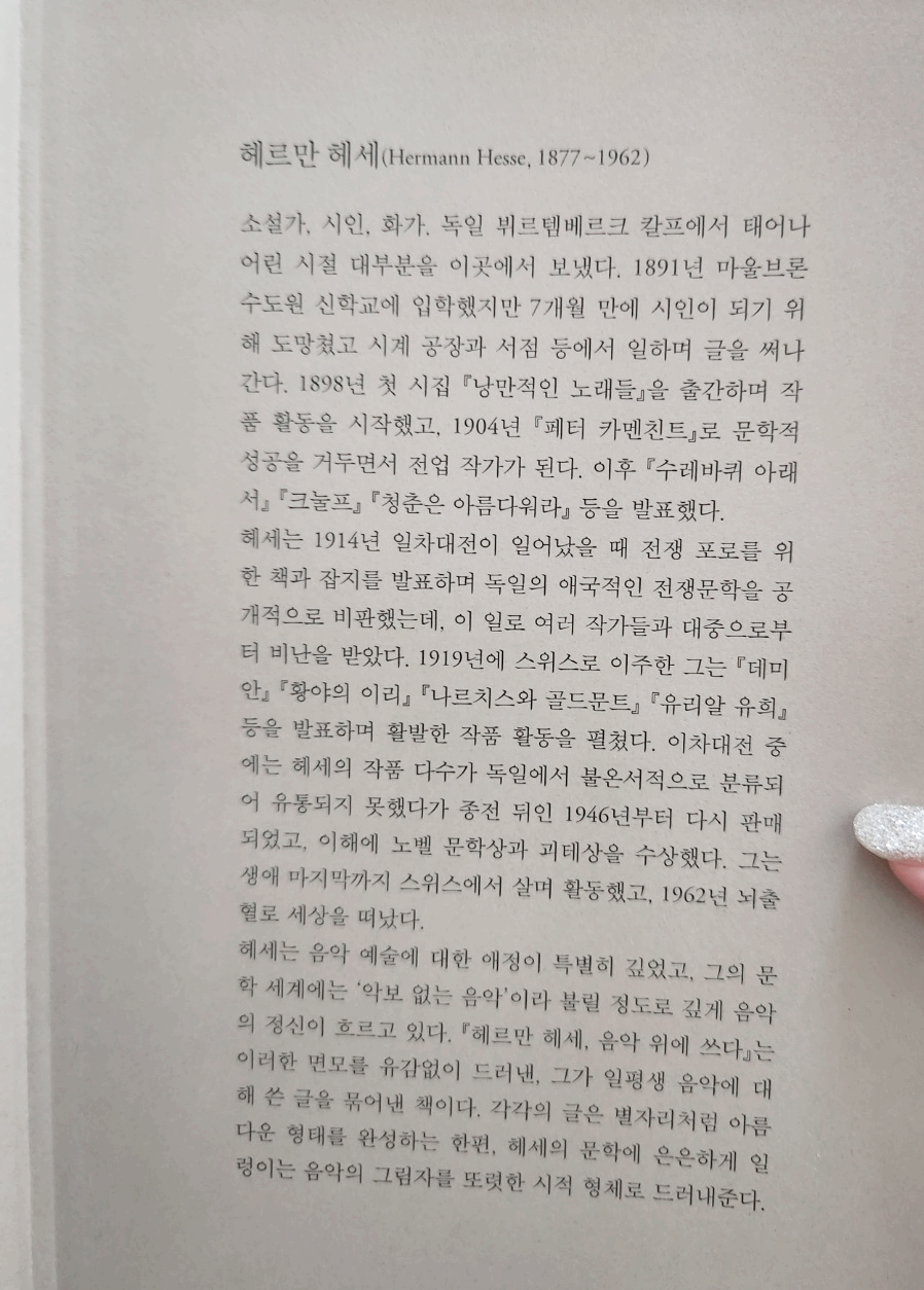 헤르만 헤세, 음악 위에 쓰다 책은 1부와 2부로 구성되어 있는데, 1부에서는 소설과 시가 한편한편 구성되어 있습니다. 그간 읽었던 헤르만 헤세의 소설책과는 달리 전개되어 어쩌면 작품 해설집 같기도 하고 또 어떻게 보면 평론집 같기도 한 책이었습니다.