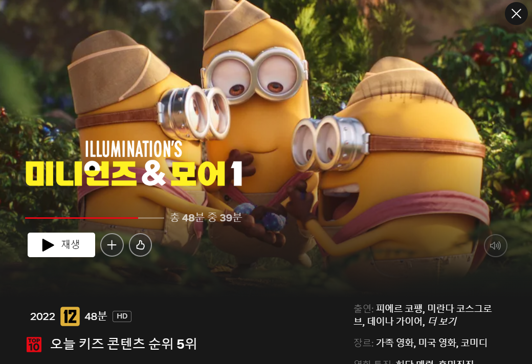 무려 '오늘 키즈 컨텐츠 순위 ' 탑 텐 안에 드는, 영화 미니언즈 & 모어 1 입니다.