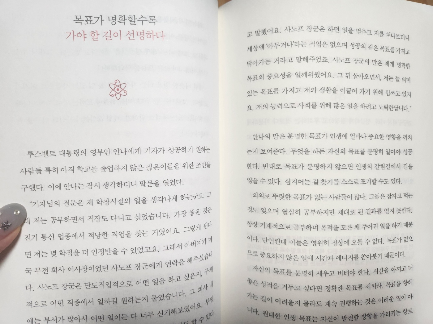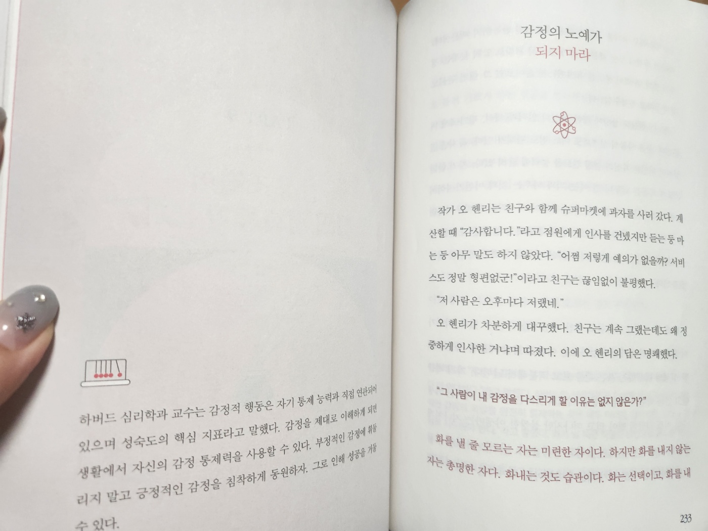 소제목들만 보면, 당연한 말 같아 보이고, 단순한 진리라고 여길 수 있는 말들입니다. 그러나 실제 사례를 통해 인생진리를 사안에 적용하고 깨달음을 주게 합니다. 어쩌면 누군가는 이미 실천하고 있는 것 들일 수도 있고, 잘 알지만 실천하지 못하고 있을 수도 있고, 필요성을 못느껴서 실천하지 못할 수도 있습니다.