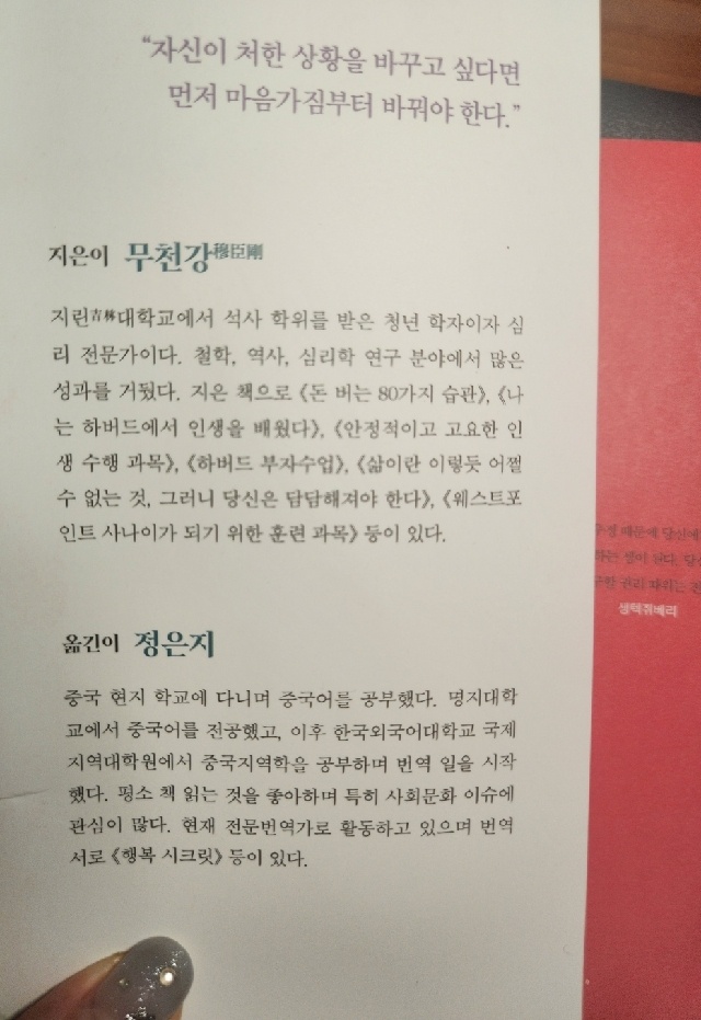 지은이 무천강은 '자신이 처한 상황을 바꾸고 싶다면 먼저 마음가짐부터 바꿔야 한다'고 말합니다. 변화가 필요한 사람이라면, 이 책을 참고 삼아 자신에게 필요한 부분은 참고해도 좋을 것 같습니다.
