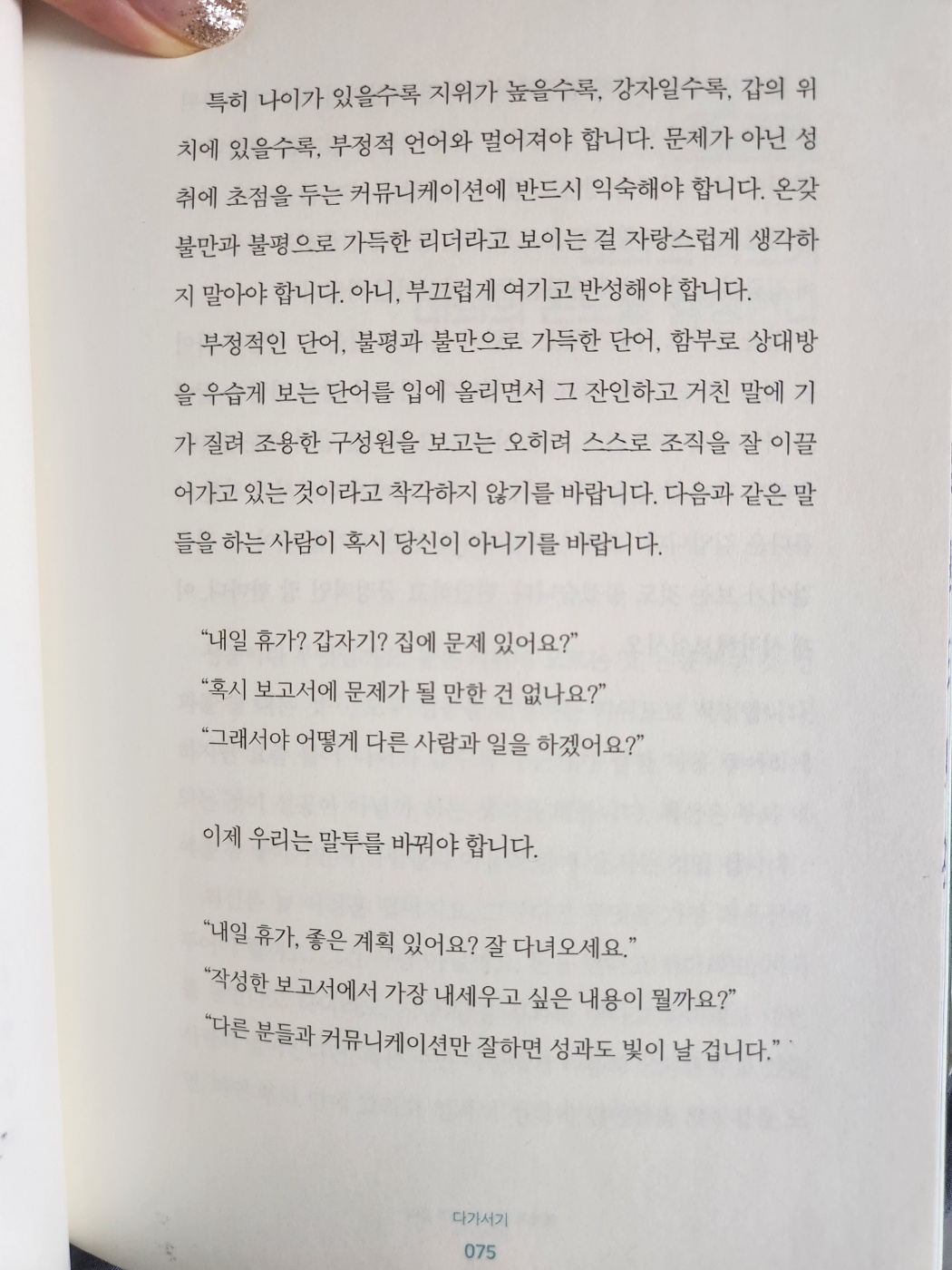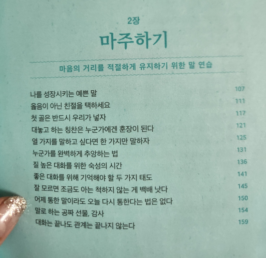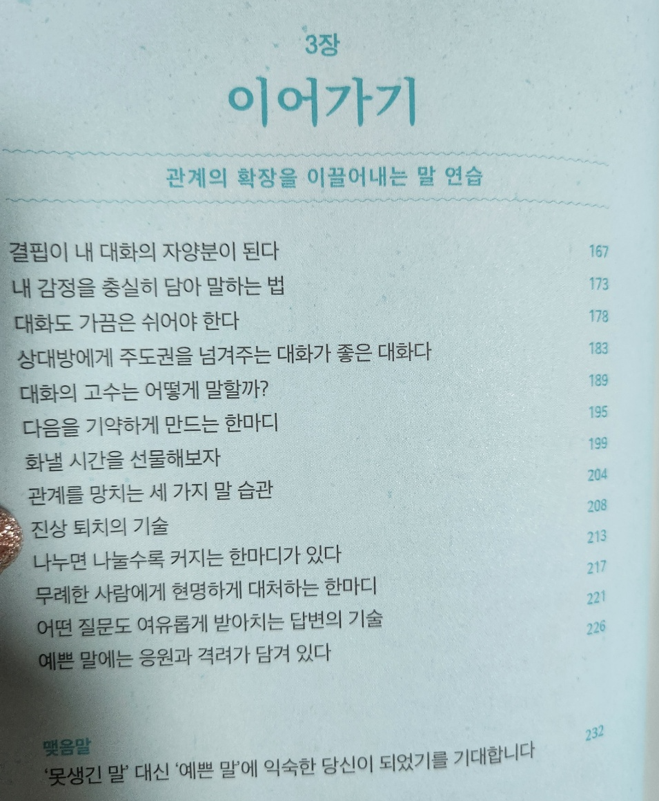 옮음과 친절 중에 친절을 택하라는 장이 있는데.. 과연.. 직업적으로 안좋은 소식을 전달하거나 옳음을 선택해야하는 경우엔 어쩌죠? 어떻게 말을 예쁘게 전달할 수 있을까요. 라는 물음표가 붙었습니다만, 작가의 의도는 잘 이해하였습니다.