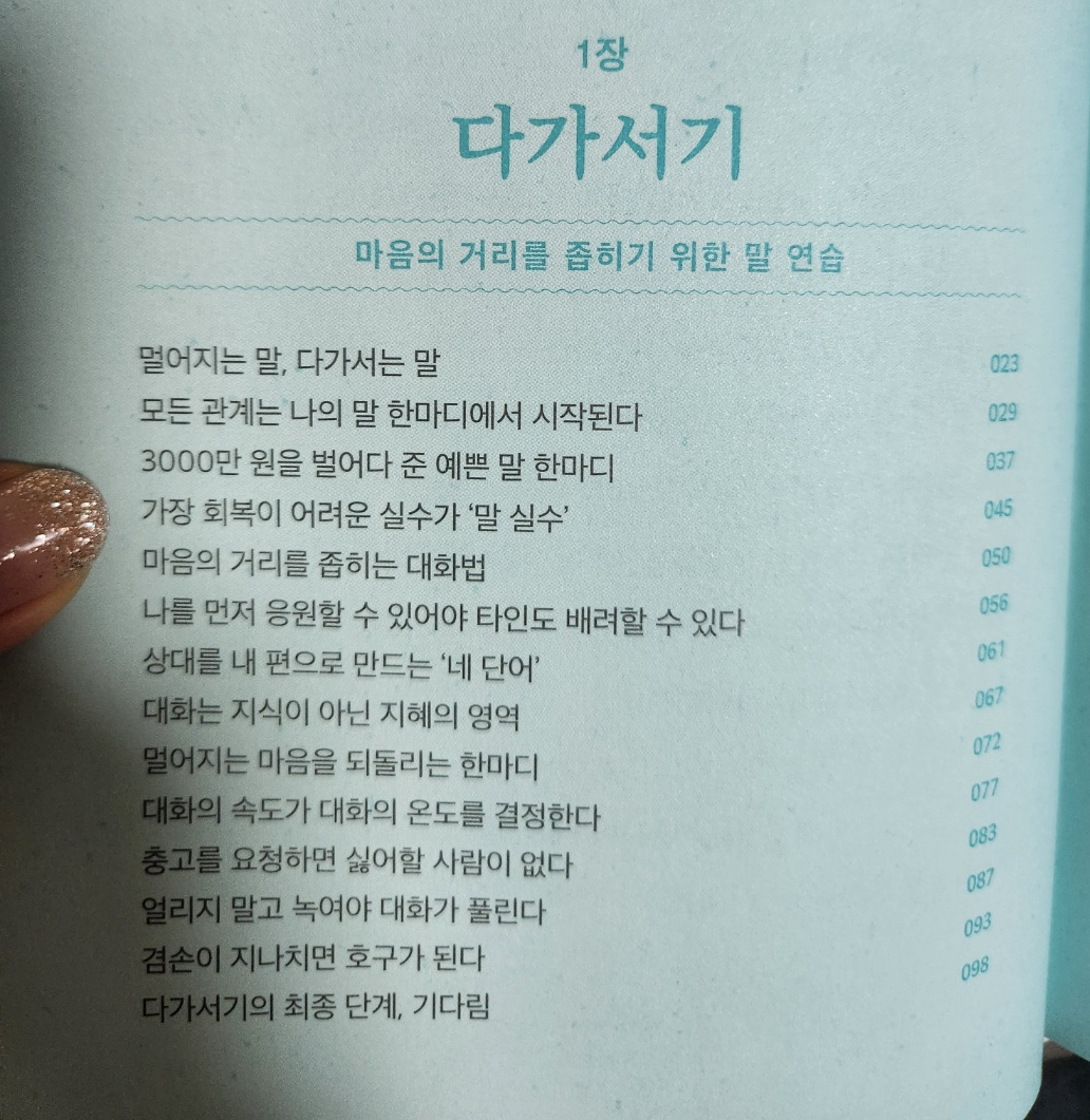 다가서기 챕터에선, 두 대화당사자간의 마음의 거리를 좁히는 말하기 방법, 자신의 말습관을 점검하는 방법을 알려주고,