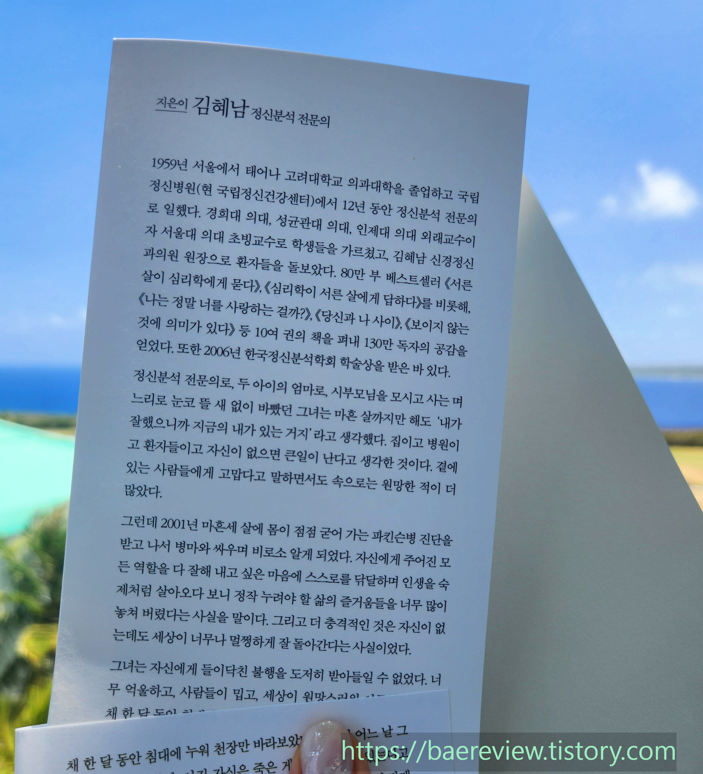 김혜남 작가님은 정신분석 전문의인데, 상담 내용을 고대로 전달하기 보다는 자신의 삶과 엮어서 유연하게 메세지를 전달하고 있습니다.
