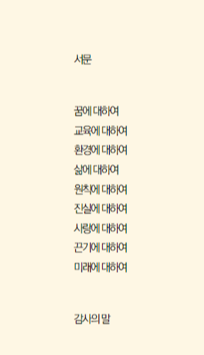 그리고 꿈에 대하여, 교육에 대하여, 환경에 대하여, 삶에 대하여, 원칙에 대하여, 진실에 대하여, 사랑에 대하여, 끈기에 대하여, 미래에 대하여순으로 자신의 어렸을적 에피소드와 함께 이야기를 전달하고 있습니다.