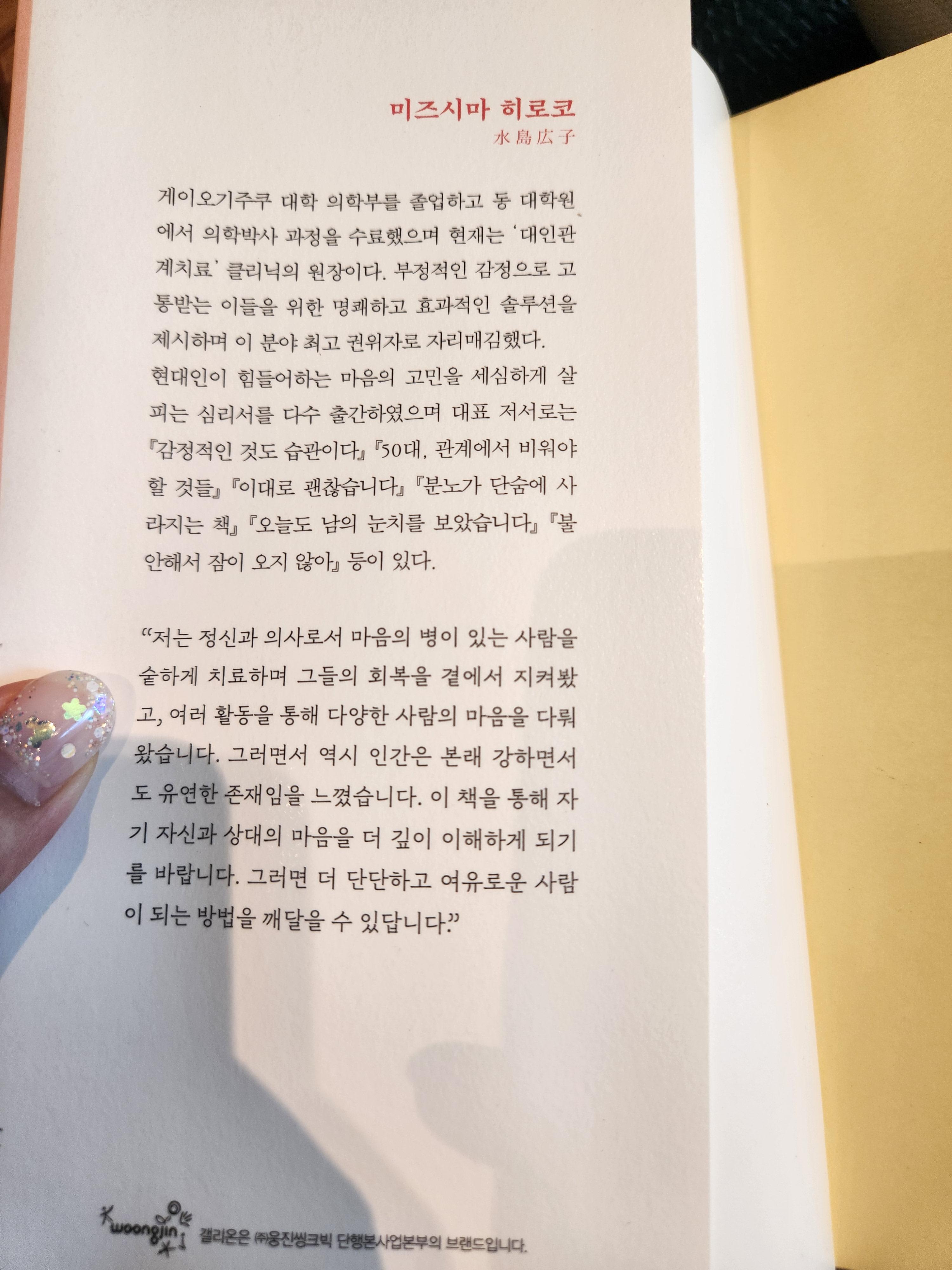 저자는 인간의 외로움, 짜증, 불안, 질투, 분노, 감정 기복 등을 다루고 있는데 이러한 감정은 자연스러운 것이라고 합니다. 정신과 의사로서 다양한 사례를 통해, 저자가 제시하는 솔루션은 명쾌합니다.