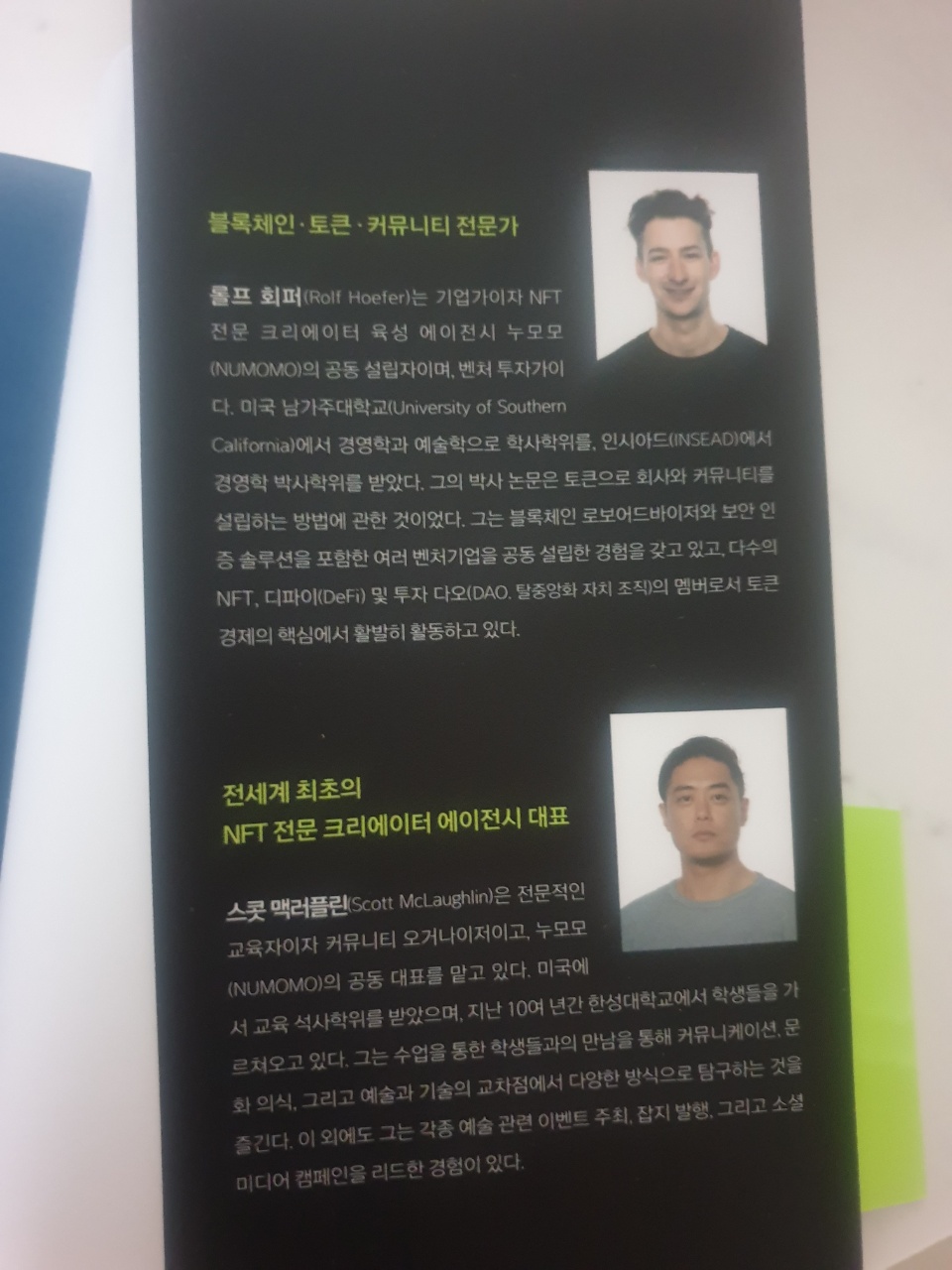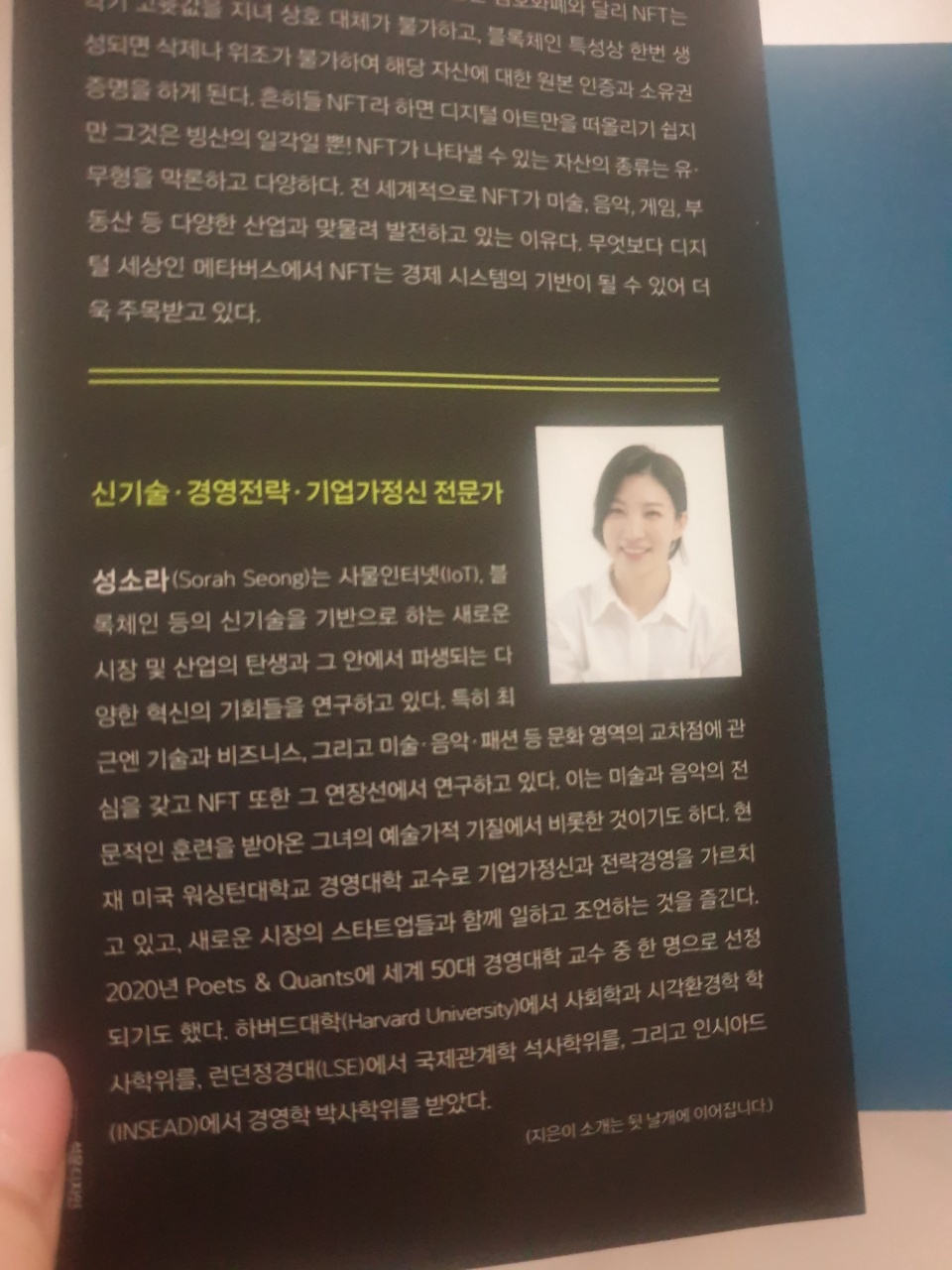 책을 읽다보면 NFT를 이용해서 활동하는 사람들 사례가 상세히 나옵니다. NFT를 이용하여 작품을 팔고, 그리고 NFT 국내 시장이 어떠한지, 현재 국내에서 유명인이 누가 있는지도 알 수 있습니다.