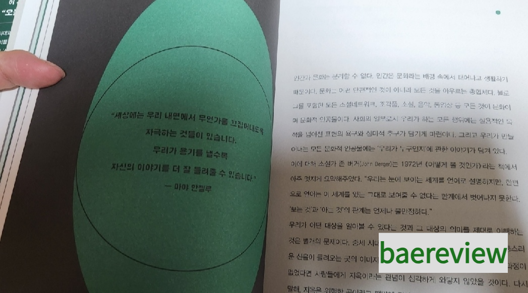 1972년 어떻게 볼 것인가 책 저자 존 버거 책도 인용되어 있고, 잘 알지 못했던 분야의 세계 유명인들도 알수 있었습니다. 각 테마별, 생각을 나누는 유명인들의 간단한 소개하고 있었던 것도 좋았습니다.