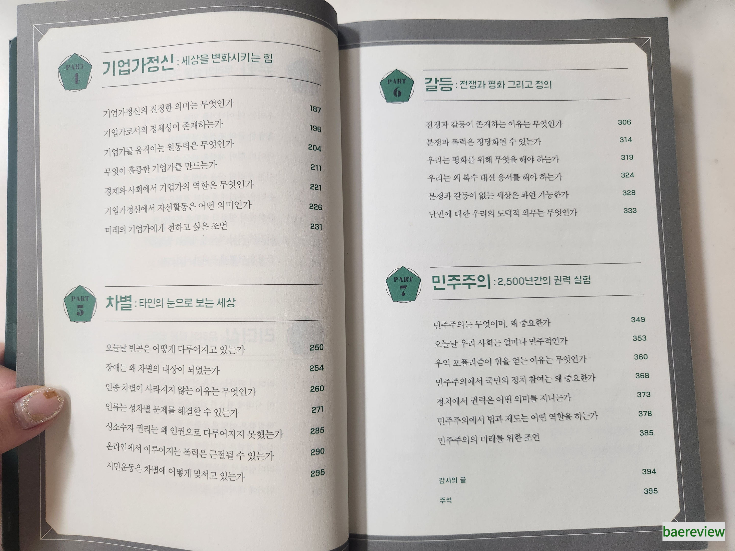 정체성, 문화, 리더십, 기업가정신, 차별, 갈등, 민주주의로 큰 목차가 나뉘어져 있습니다.