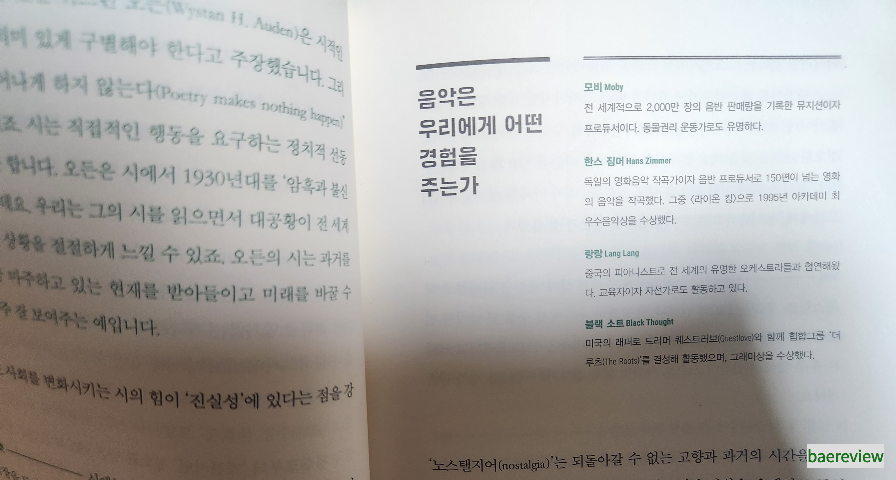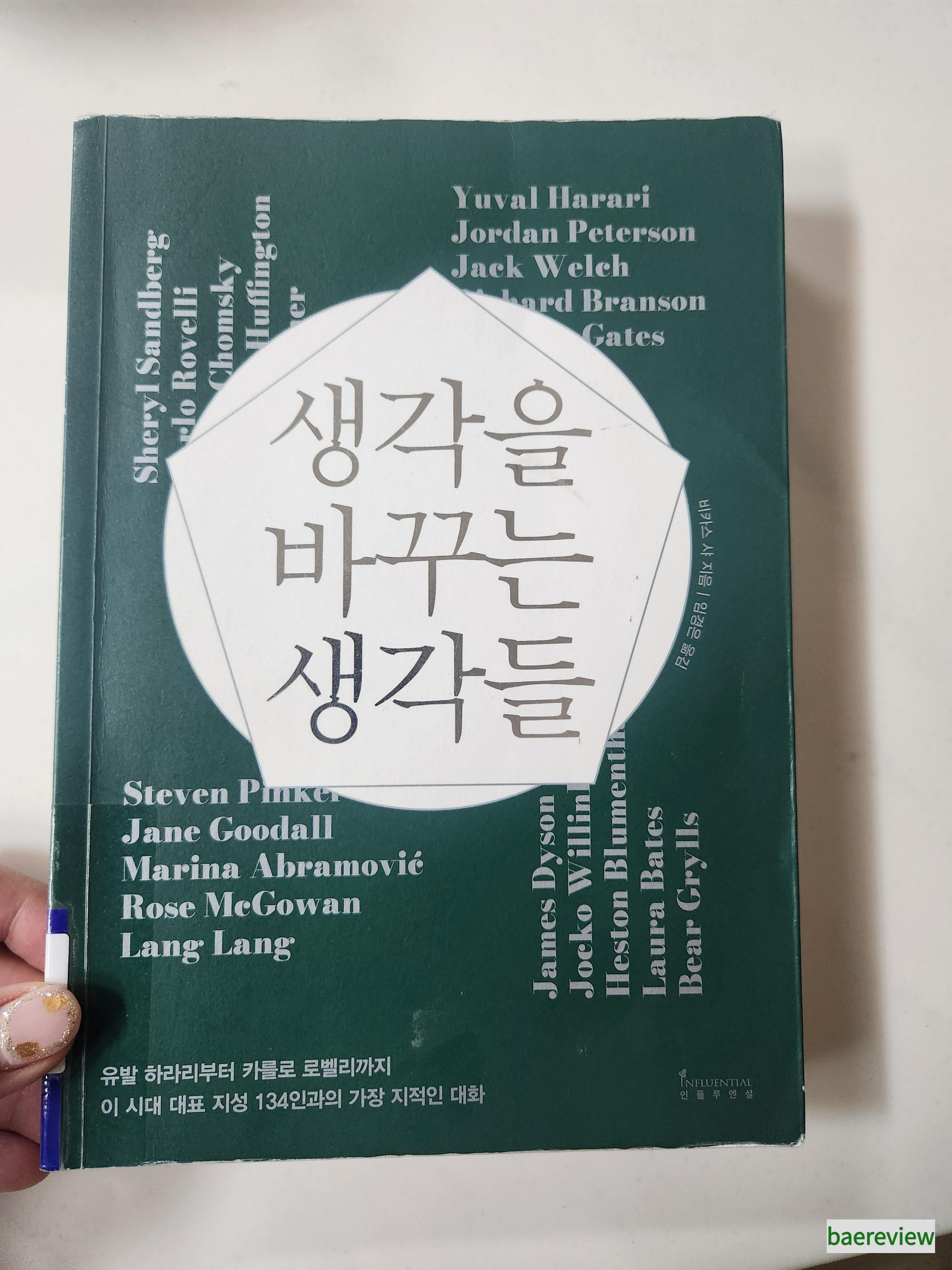 유발 하라리, 조던 피터슨, 제인 구달, 제임스 다이슨, 셰릴 샌드버그, 한스 짐머 등 각 분야의 유명인사들의 생각을 들어볼 수 있어 좋았습니다. 그러나 아쉽게도, 이 시대 리더 134인에 한국인은 없었습니다.