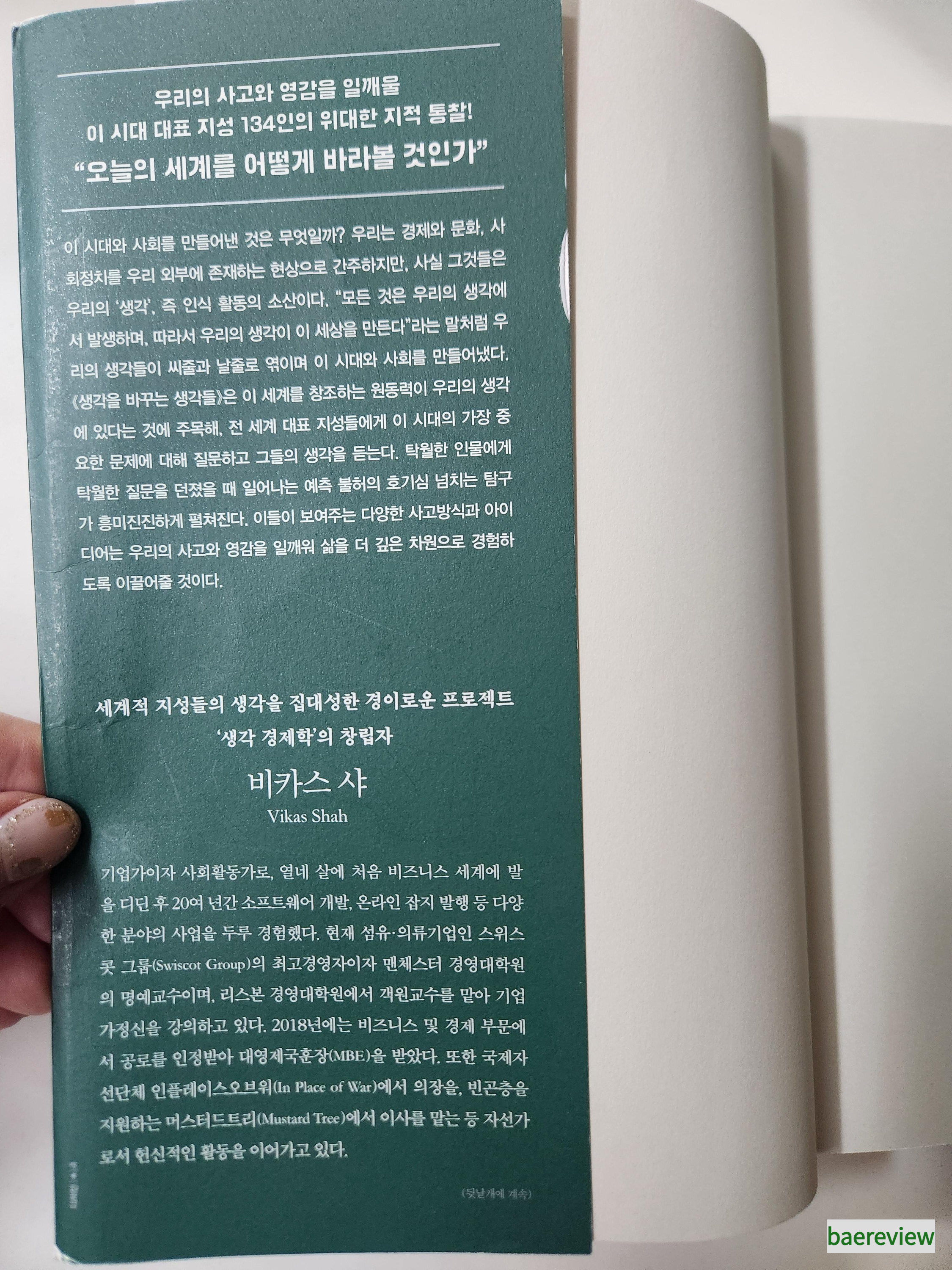 저자는 2007년부터 현시대, 비교적 최근래에 영향을 준 인물들을 인터뷰 하는 '생각 경제학 프로젝트'를 진행했고, 이러한 내용을 이 책에 담아내고 있습니다. 저자 비카스 샤는 '이 세계를 창조하는 원동력이 우리의 생각에 있다'는 사실에 주목하고 있어 신선했습니다.