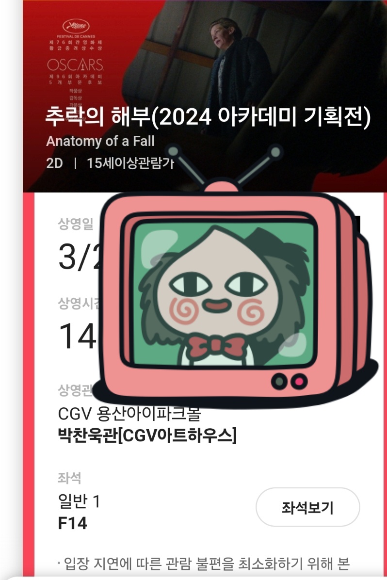 영화 <추락의 해부>가 2024년 3월 미국 아카데미 시상식에서 수상하기 전에, 이미 관심이 많았습니다. 상영관이 적어서 원하는 시간대와 장소를 선정하기가 쉽지 않았습니다. 용산아이파크몰 박찬욱관에서 상영하는 표 구해서, 감상했습니다.