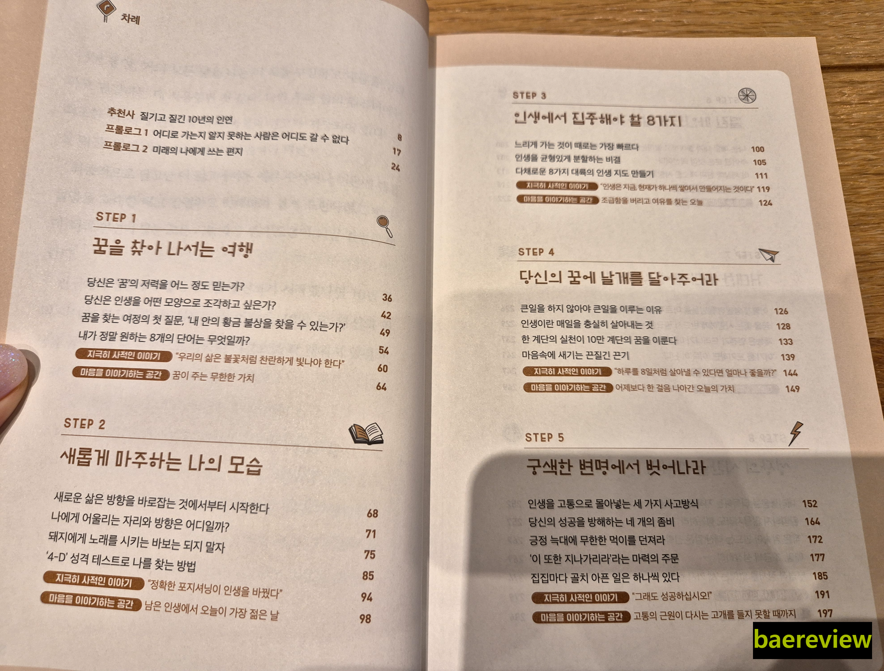 총 8개의 스텝으로 구성되어 있습니다. 자신이 원하는 꿈을 향해 나아가는 방향을 제시하고 있지만, 그 방향성을 잠깐 놓치거나, 헷갈리는 독자들을 위해 스텝1,2 단계부터 천천히 설명해나가고 있는 책입니다.