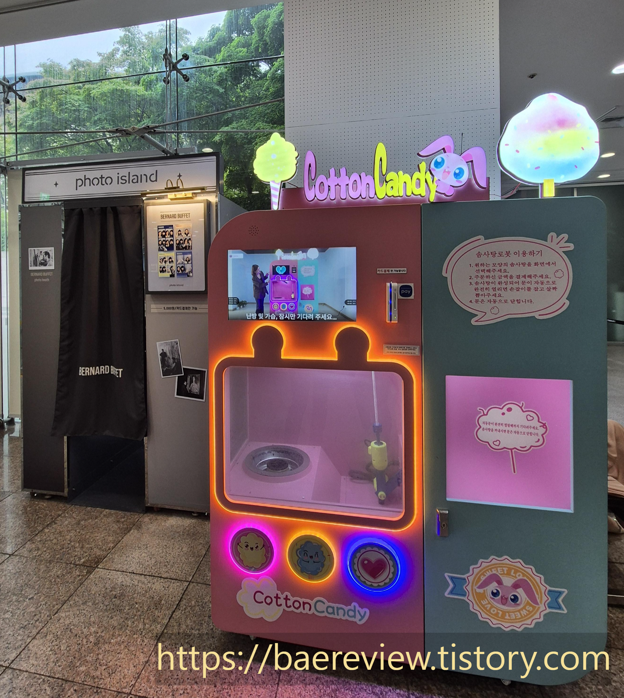 전시회에서 나와서, 제3전시실도 구경거리가 많았습니다. 4컷 사진을 찍으면, 베르나르 뷔페 전시 마크가 달리는 사진부스도 있고, 솜사탕 기계도 있었습니다.