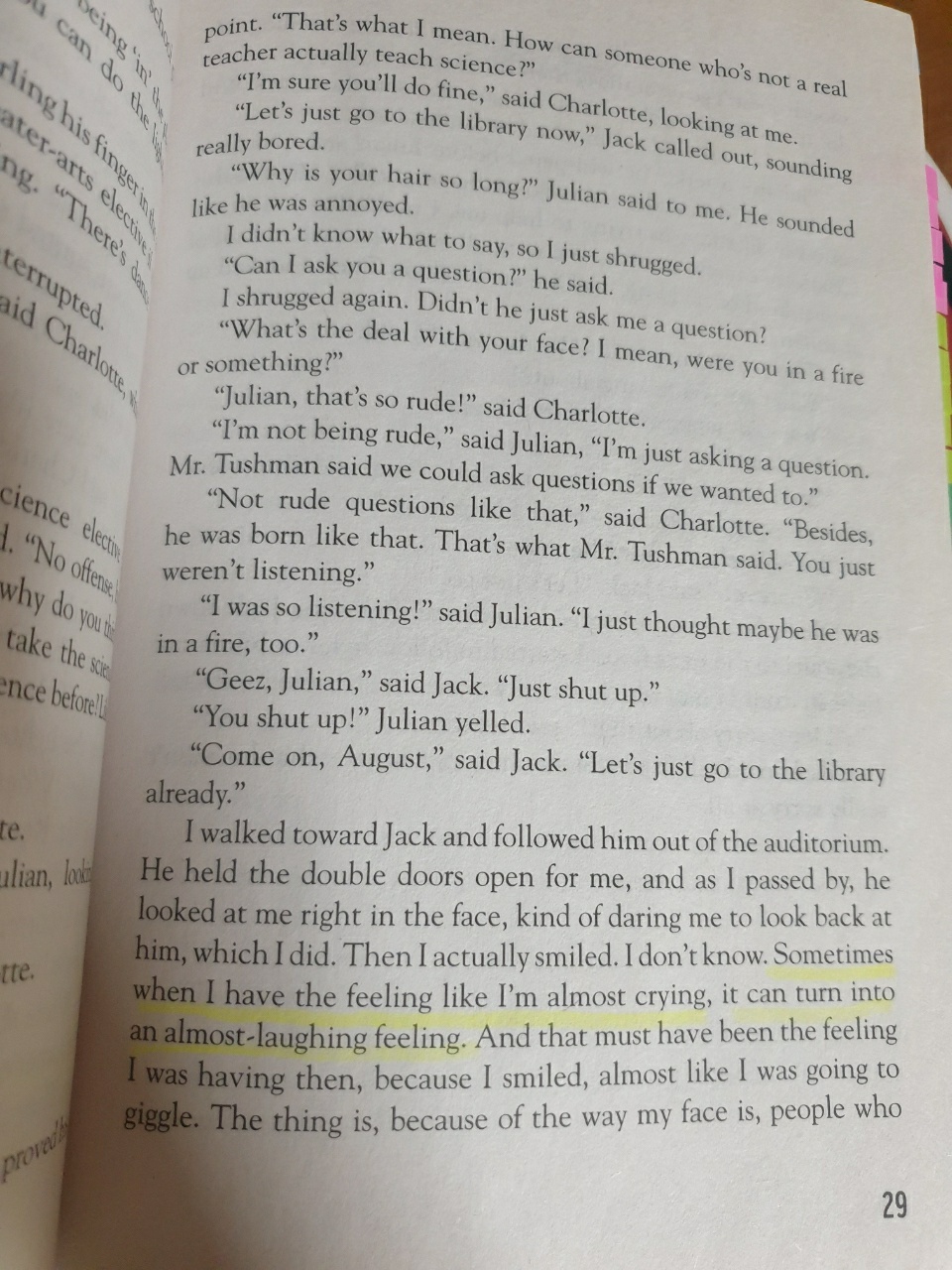 집에서 홈스쿨링을 하였지만, 어느 순간부터는 등교를 하여야 하는 것이 맞다고 판단하고, 등교를 결심합니다. 그 과정이 쉽지 않습니다. 막상 등교하였으나, 어기의 얼굴을 본 아이들의 반응은 피하거나, 놀리거나 두가지로 나뉩니다. 어떤 무리는 몬스터, 골룸이라고 놀리며 어기에게 상처를 주기까지 합니다.