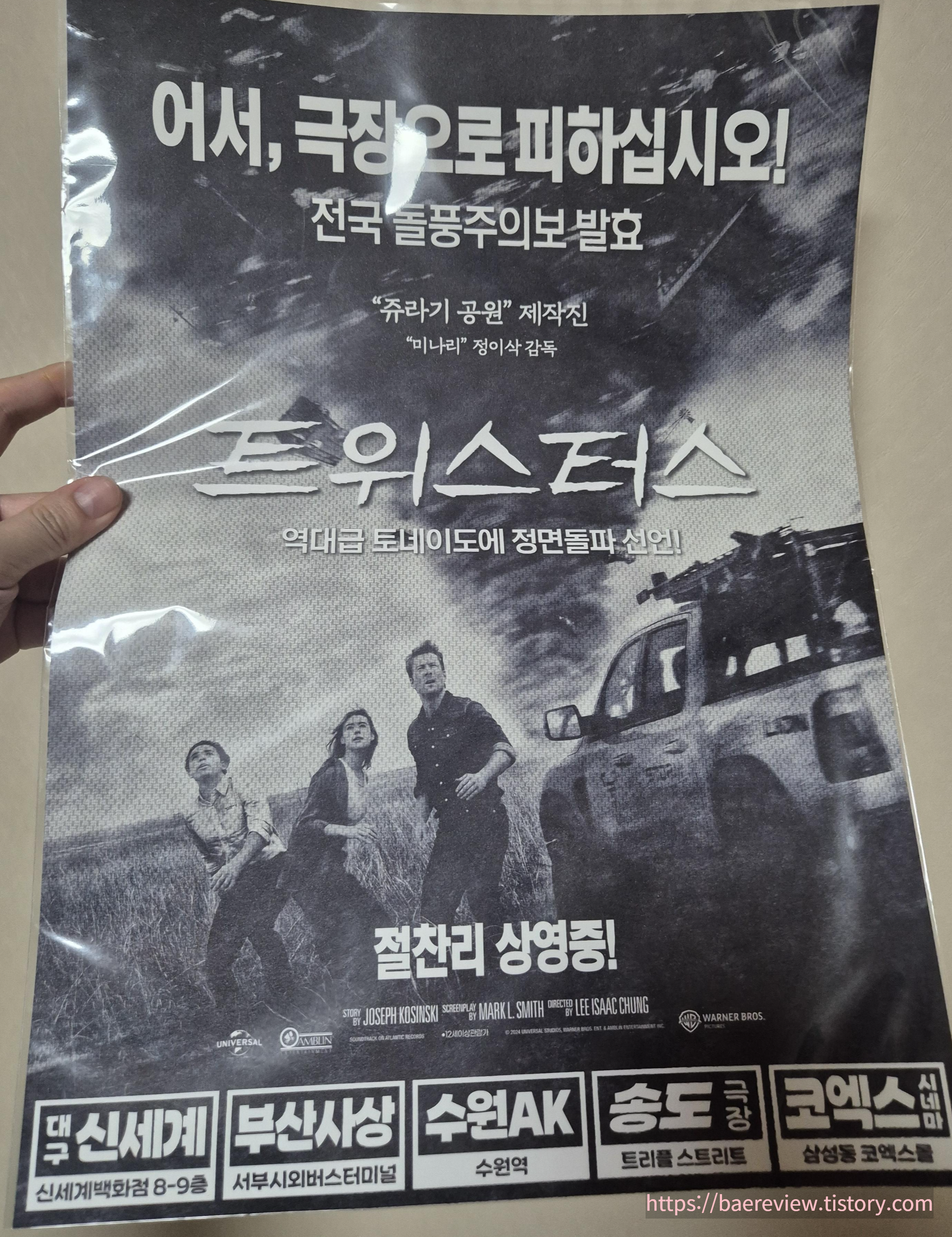 예전 80년대 영화관 포스터 느낌은 나지만, 뭔가 미국의 허리케인을 느끼기에는 조금 부족합니다. 2024년 9월 30일에 폐관한 서울시 중구 대한극장에서 상영한 마지막 영화가 이 <트위스터스>이라고 하는데, 아마 이를 염두하고 만들어진 것 같습니다.