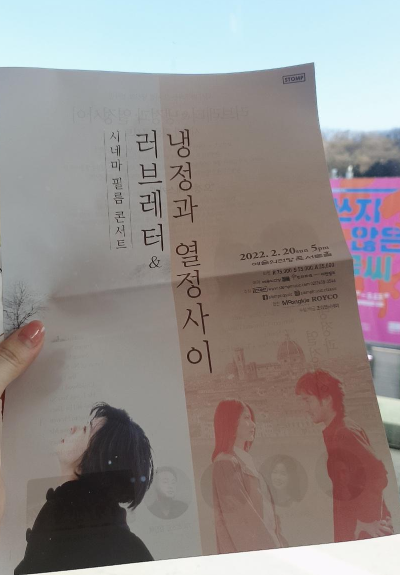 예술의 전당 콘서트홀에서 종종 영화 테마 주제곡을 선별해서 콘서트가 열렸습니다. 이번에는 모두가 좋아할 만한 영화 '냉정과 열정사이'와 영화'러브레터'의 주제곡을 들을 수 있는 시네마 필름 콘서트가 열렸습니다. 시네마 필름 콘서트가 열린다는 것을 알자마자 바로 표를 예매했습니다.