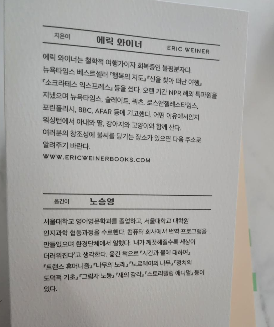 책 제목부터 '천재의 지도'라고 되어 있어서, 천재라고 생각하는 사람들이 태어난 곳을 찾아보는 내용인가 라고 생각했습니다. 에릭와이너가 철학적 여행가 인만큼, 당연히 해당 도시들의 철학자가 등장할 것이라고 생각했습니다.