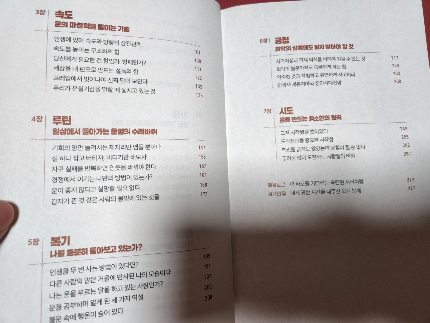 이 책 저자가 정의내리고 있는 '운'이란 세상이 내게 던진 수많은 질문과 기회에 대한 나의 선택이라고 합니다. 세상이 내게 던진 수많은 선택지에 대한 나의 답이 모두 합쳐 나의 운을 만들기 때문에, 좋은 선택을 할 수 있는 역량을 기르는 것이 맞다고 생각합니다.